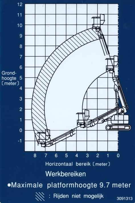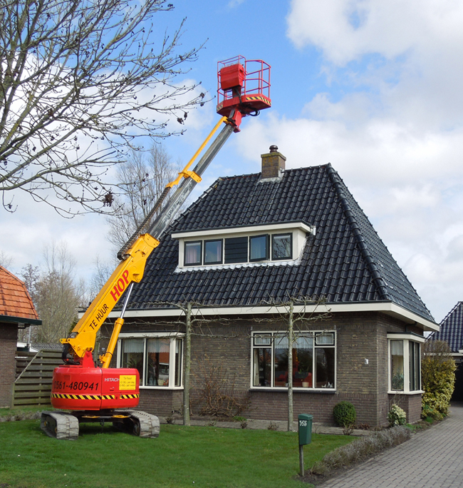 Met de Hitachi HX99B kunt u tot op maximaal 11,5 meter hoogte werken. De hoogwerker staat op een een wit rupsonderstel, dat geen strepen geeft op beton.